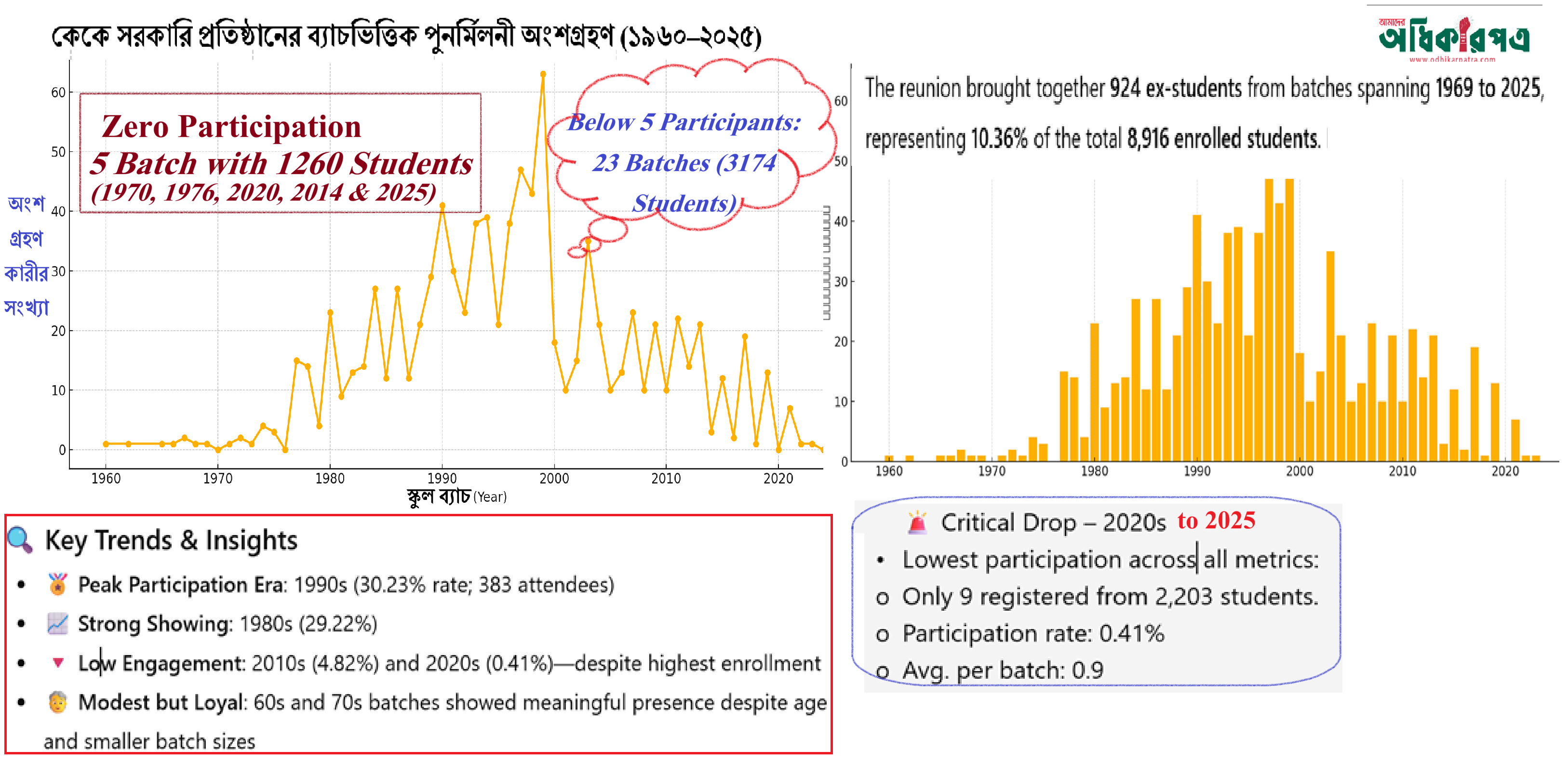 ৬৩টি ব্যাচ, ৮,৯১৬ জন শিক্ষার্থী। সেখানে U-shaped curve: ৮০–৯০ দশক সর্বাধিক অংশগ্রহণ, ২০১০–২৫ প্রায় শূন্য। পরিসংখ্যানে: