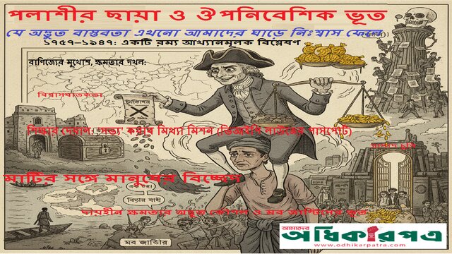 পলাশীর যুদ্ধ থেকে শুরু করে দ্বৈত শাসন ও চিরস্থায়ী বন্দোবস্ত—ঔপনিবেশিক শাসনের এই ভূত আজও আমাদের প্রশাসন, শিক্ষা ও সমাজে দায়হীন ক্ষমতার রূপে বেঁচে আছে। ১৭৫৭ থেকে ১৯৪৭ পর্যন্ত উপনিবেশিক শোষণের যে কাঠামো তৈরি হয়েছিল, তার প্রেতছায়া আজও আমাদের অর্থনীতি ও প্রাতিষ্ঠানিক বৈষম্যে বর্তমান।